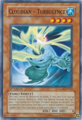Card Text: This card cannot be destroyed by battle. If this card is in face-up Defense Position, destroy it. When you Normal Summon this card, place 1 Fog Counter on it for each "Cloudian" monster on the field. You can remove 1 Fog Counter from this card to Special Summon 1 "Cloudian - Smoke Ball" from your Deck or from either player's Graveyard.